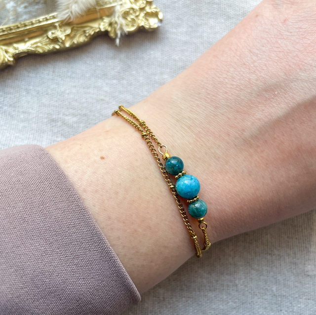 Bracelet en pierre naturelle d'apatite. elle stimule la communication, la clarté mentale et l’expression personnelle. Elle favorise la confiance en soi, la motivation et soutient la créativité. C'est une pierre apaisante.. Le Bracelet est en acier inoxydable doré ainsi que les apprêts. Les perles naturelles sont quant à elles 100% naturelles et de qualité AA (Très bonne).