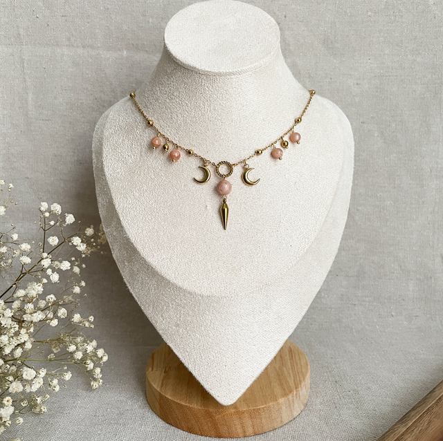 Collier ras de cou de 40cm + 5cm composé de perles en pierre naturelle et de charms croissants de lune montés sur une chaîne en acier inoxydable dorée et perlée. Un bijou féminin dédié à la magie de la lune. Il est personnalisable : vous pouvez choisir entre la pierre de lune et la pierre de lune rose.