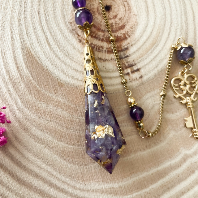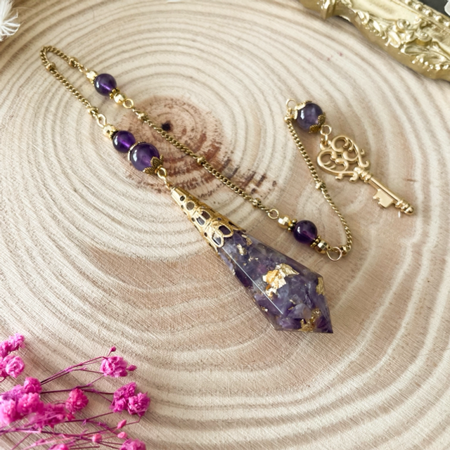 La chaine est perlée tout le long avec des perles naturelles d'améthyste ainsi que des petites perles en acier doré. Le pendule est parfait pour la pratique de la radiesthésie que ce soit pour les débutants ou les experts. Un charm clé vient terminer la chaine, la clé symbolise la capacité d’ouvrir des portes : celles de la conscience et des dimensions spirituelles. Elle représente un accès à de nouvelles connaissances ou à des vérités profondes.