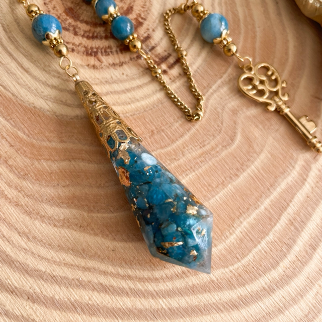 Grand pendule divinatoire en résine incrustée de pierres naturelles d'apatite bleue.