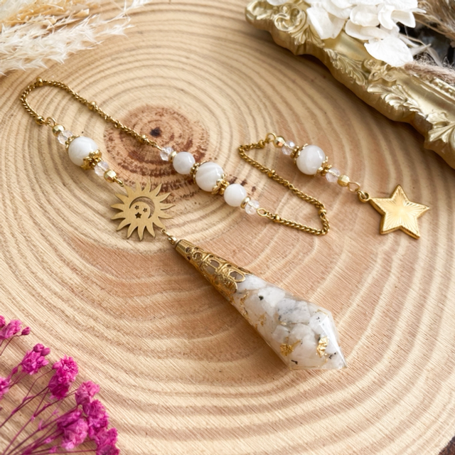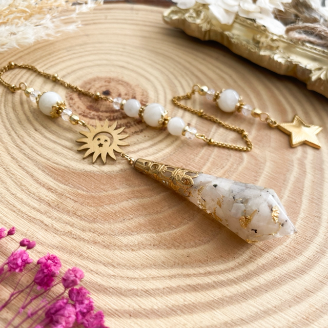 Pendule divinatoire en résine incrustée de pierre naturelle de pierre de lune.