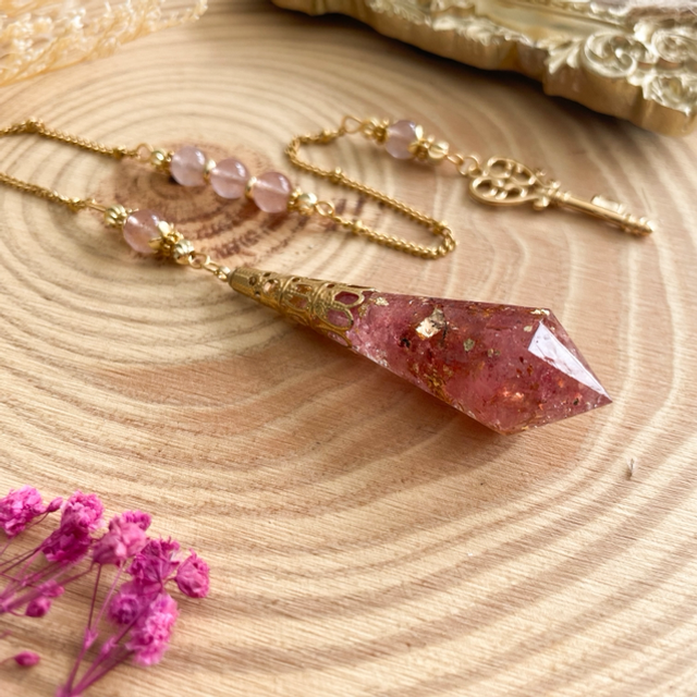 Grand pendule divinatoire en résine incrustée de pierres naturelles de quartz fraise.