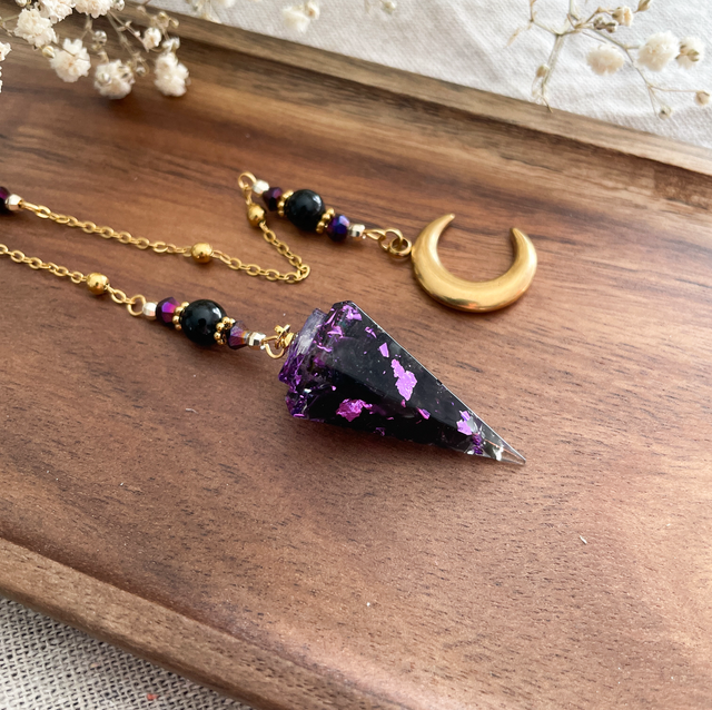 Pendule divinatoire en résine incrustée de pierres naturelles d'obsidienne