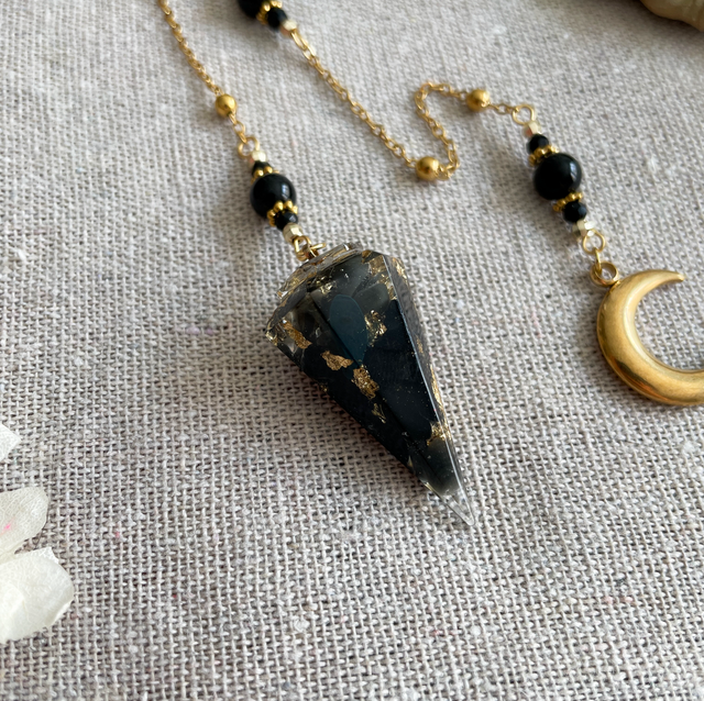 Pendule divinatoire en résine incrustée de pierres naturelles d'obsidienne