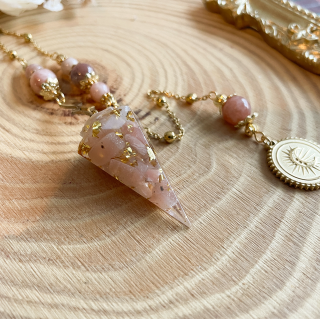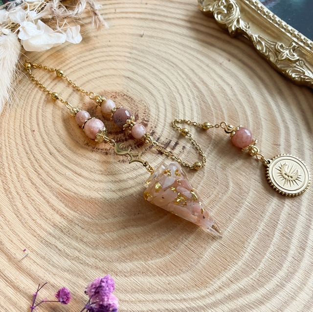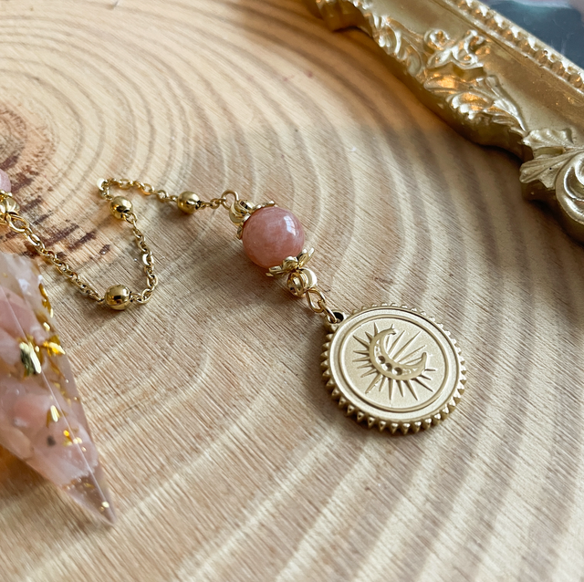 Pendule divinatoire en résine incrustée de pierre naturelle de pierres de lune rose. Il se compose d'un connecteur en acier en forme de lune/étoile, de perles naturelles de pierre de lune rose, d'apprêts en acier et se termine par un joli charm médaillon doré avec une lune gravée dessus.