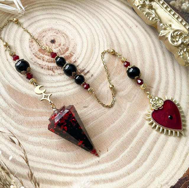 Le pendule est en résine dans laquelle j’incruste des mini pierres d’obsidienne naturelles.