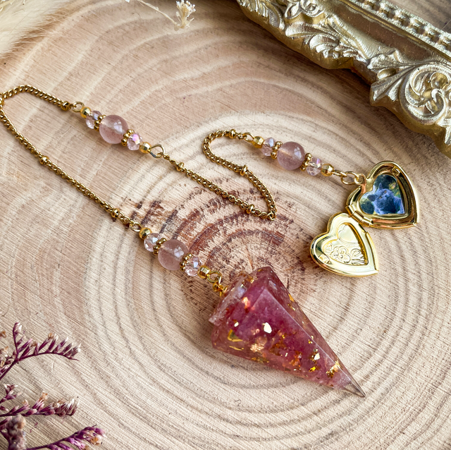Pendule divinatoire en résine incrustée de pierre naturelle de quartz fraise. Le quartz fraise favorise la joie de vivre, l’amour et la douceur. Il apaise le cœur, attire les bonnes énergies et aide à renforcer la gratitude au quotidien. La chaîne se compose d'une chaîne en acier inoxydable dorée, de perles naturelles en quartz fraise, perles en verre (les petites) et perles en acier. La chaîne se termine par un médaillon cœur en laiton (léger) dans lequel vous pouvez ajouter une photo, un bout de tissu, un cheveu, des poils.. Il peut servir de pendule témoin ou tout simplement dans un but commémoratif. (Photo non incluse dans le produit!).