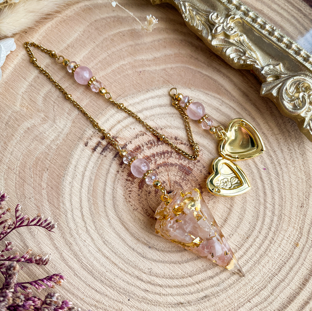 Pendule divinatoire en résine incrustée de pierre naturelle de quartz rose. Le quartz rose apporte douceur et apaisement. Il est reconnu pour stimuler l’amour de soi, attirer l’harmonie relationnelle et apaiser le cœur des blessures affectives. La chaîne se compose d'une chaîne en acier inoxydable dorée, de perles naturelles en quartz rose, perles en verre (les petites) et perles en acier. La chaîne se termine par un médaillon cœur en laiton (léger) dans lequel vous pouvez ajouter une photo, un bout de tissu, un cheveu, des poils.. Il peut servir de pendule témoin ou tout simplement dans un but commémoratif. (Photo non incluse dans le produit!).