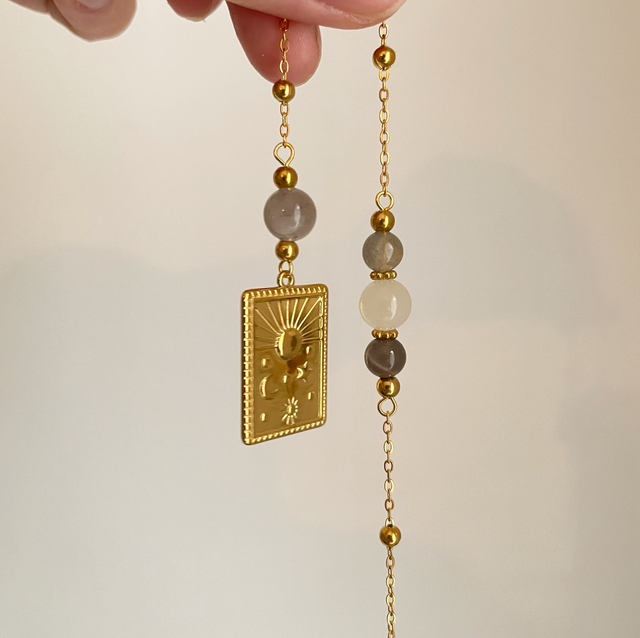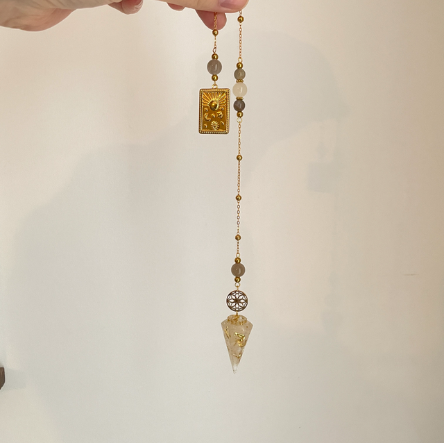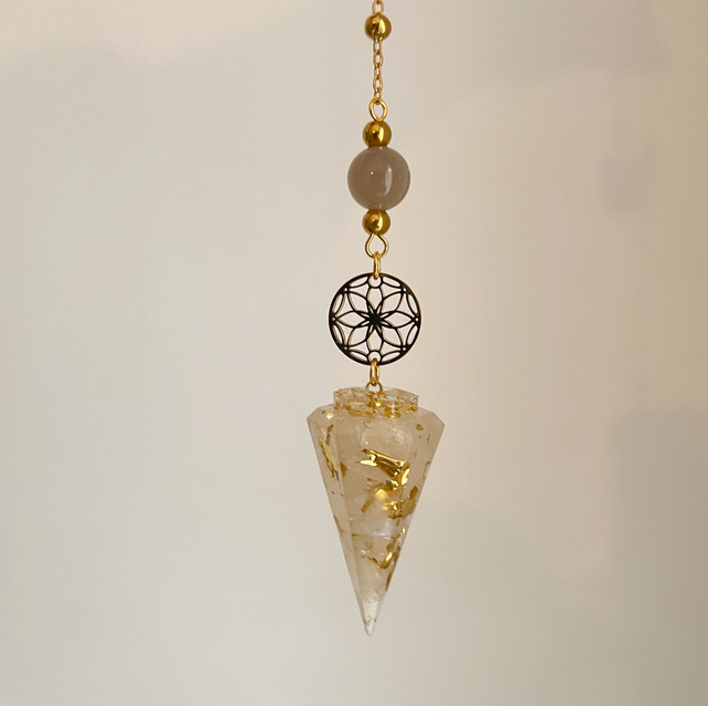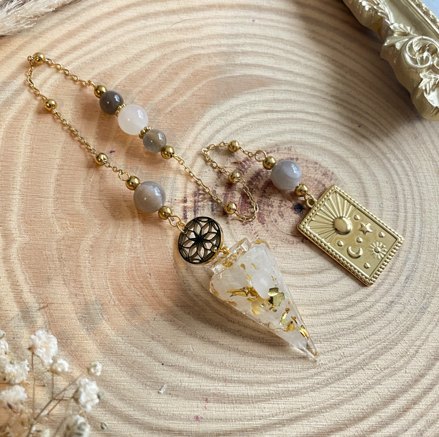 Nouvelle édition limitée : Pendule divinatoire en résine incrustée de pierre naturelle de pierres de lune. Ce pendule de voyance est parfait pour les débutants comme pour les plus expérimentés. Il se compose d'un connecteur en acier en forme de fleur, de perles naturelles de pierre de lune et de pierre de lune grise, d'apprêts en acier et se termine par un joli charm carte lune étoile. La chaîne est 100% en acier inoxydable, pendule d'excellente qualité. Bien sécher si contact avec de l'eau.