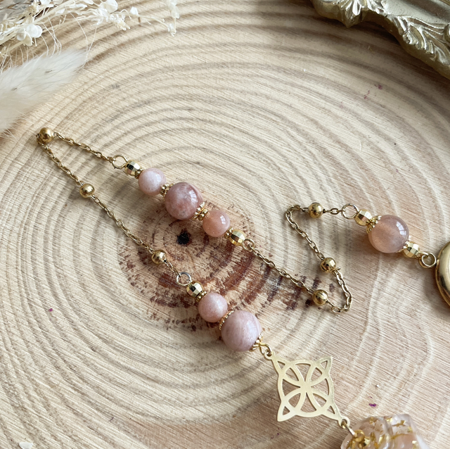Pendule divinatoire et de radiesthésie en résine incrustée de pierres naturelles de pierre de lune rose. La chaîne se compose d'un connecteur nœud de sorcière, de perles en pierre de lune rose, de perles en acier et se termine par un joli charm croissant de lune doré. Ce pendule divinatoire correspond aussi bien aux débutants qu'aux plus expérimentés.